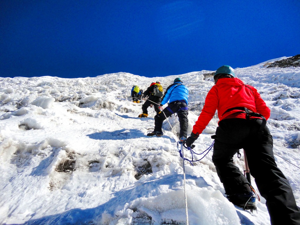 The climb can be very challenging if there is a lot of snow, if there has been no snow and higher temperatures, then you will find less ice on the head wall, and undulating ice climb, which can make it an easier or harder climb to the summit. Because you never know what the conditions will be, you must not show up under prepared!