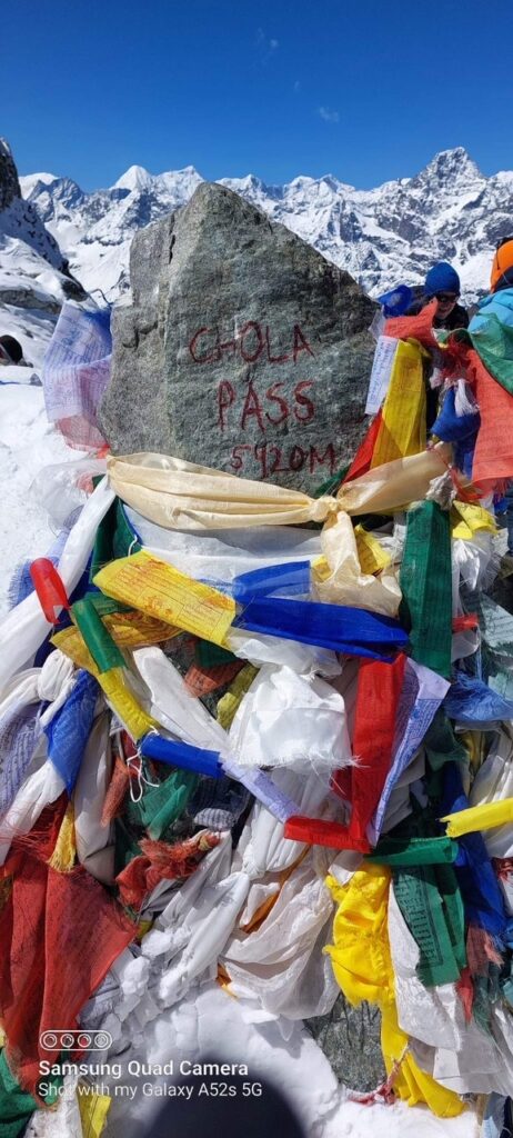 Thaknak over the Cho-la Pass 5,367m/ 17,604 ft to Dzongla 4,830m/ 15,939 ft. Crossing the Cho La Pass is very challenging and not to be underestimated. Today is the toughest day of the trek and we need to start early at 4-6am compared to other days on the trip. The pass is not itself difficult, but it is steep and involves a glacier traverse on the eastern side. We need to be careful as the trail is steep and the rocks glazed by ice making this tricky for inexperienced trekkers. The trail from Phedi climbs through a ravine and a rocky trail as we climb up continuously. While trekking through the side of a frozen lake we reach at the top of the pass decorated with prayer flags. Ama Dablam commands the skyline over a range of mountains on the south even as Cholatse soar on the west and Lobuche East and Baruntse rises sharply to our right. We need to pass through some crevasses before we reach Dzongla, another beautiful place with a complete view of Cholatse, Ama Dablam, Lobuche peak and the Pheriche village far below. We will overnight at a very basic local lodge. 7/8 hours of trekking today.